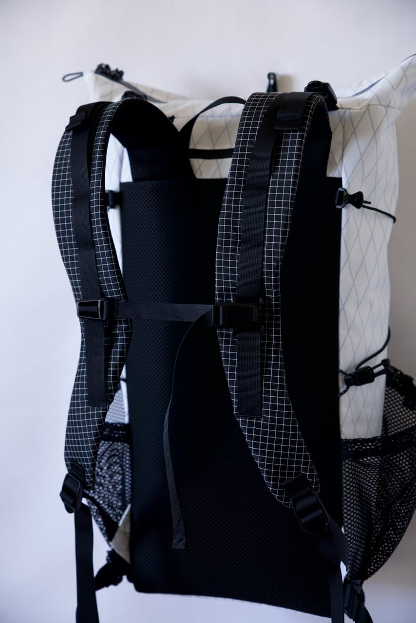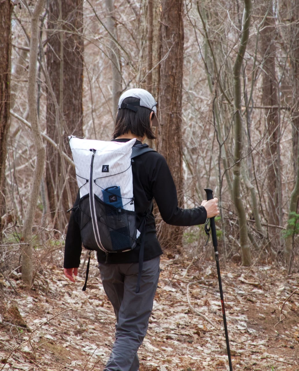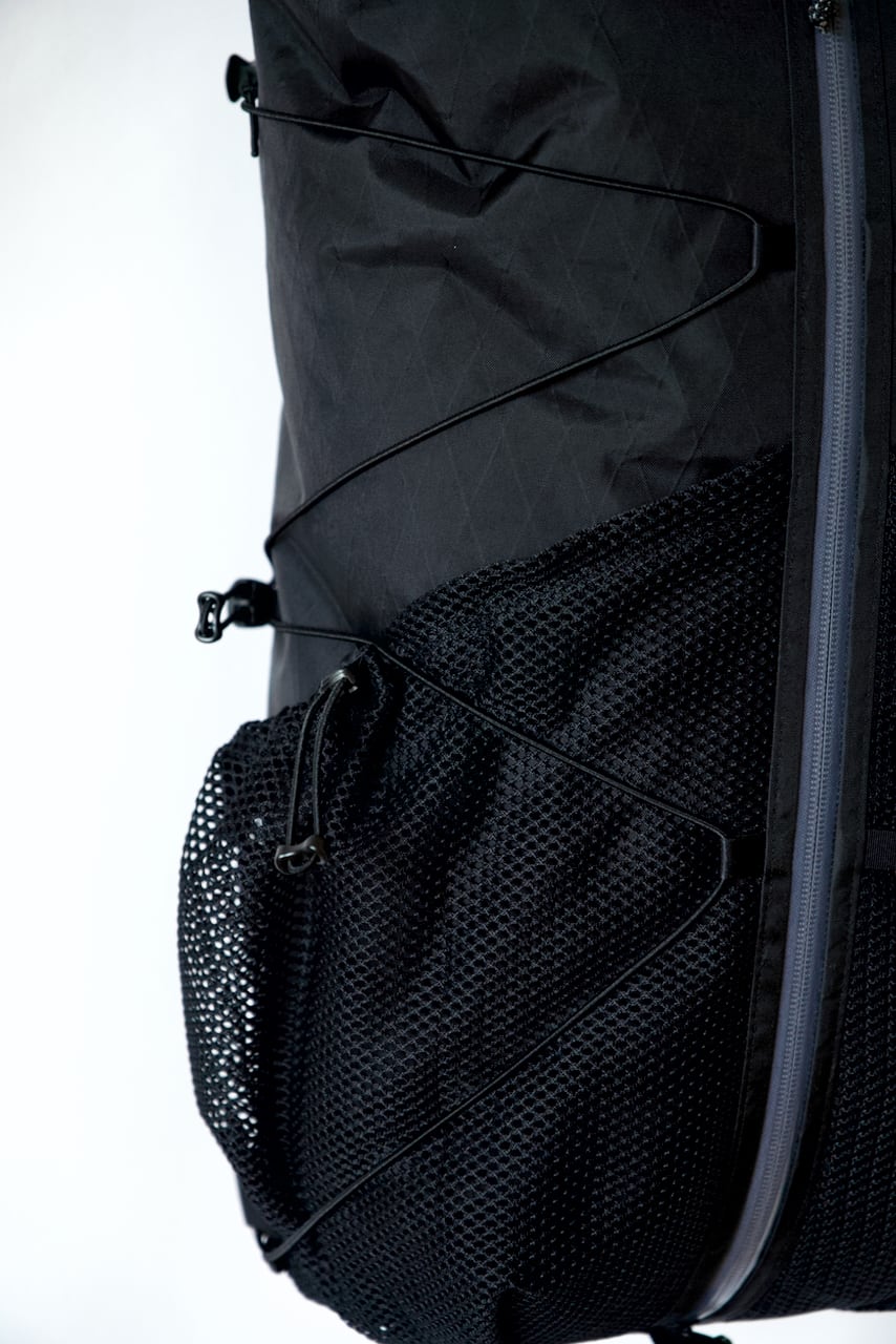 バックパックの前面から側面まで広がるメッシュポケットは、頻繁に使用するアイテムや行動食、ボトル、トレッキングポールなどの収納に便利です。背面上部には財布やスマートフォン、鍵などの貴重品を安全に収納できるポケットも装備しています。